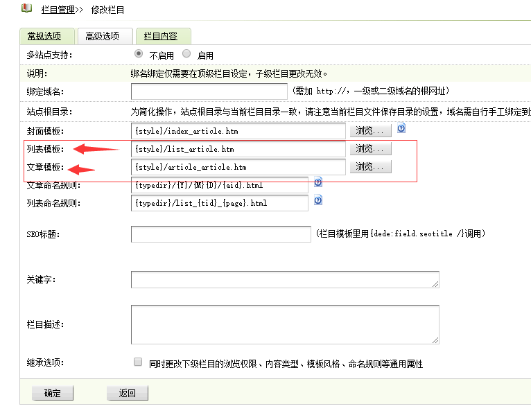 如果是选择最终列表栏目属性,那么他对应的模板文件就是上面红框的那两个,一个是列表页模板list_article.htm和内容页模板article_article.htm,这些模板名称都是可以修改的,所以在这里你看到的是什么模板名称,他就是对应这个栏目的模板文件。