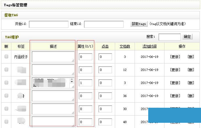 这里的TAG属性可以根据自己的需要填写任意数字,比如属性是0、1。如果你觉得不直观,那就换成a,b,c之类的,只需要修改dede_tagindex数据表addtagtype数据类型为varchar,长度为255即可,方法就不详述了,下面是调用方法。