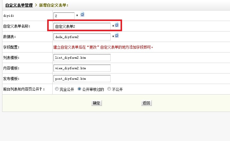 'dede_diyform1' 是你要调用的表的名称 [field:dosxp/] 是你添加的表的字段名称 要想无需审核 提交之后立刻显示 在增加新表单的"前台列表和内容页公开?:"选项选择"完全公开"