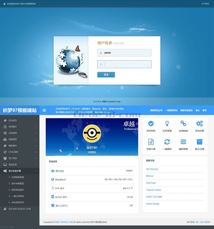 可以查看参考,其他使用攻略基本和原版织梦差不多,作为新手可以上网查询,而且在模板根目录有两个文档已经记录简明扼要的攻略,在此不赘叙,最后再次感谢使用织梦97