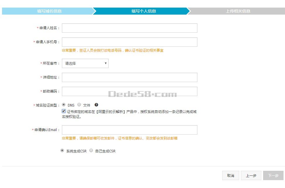 7.填写个人信息,如果域名也在阿里云,域名验证类型可以选择DNS,并勾选。如果域名不在阿里云且服务器是linux的,那么选择文件。