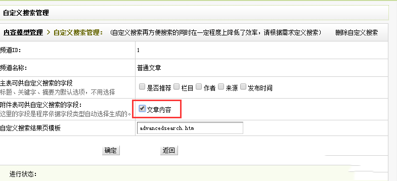 1、后台-->核心-->频道模型-->内容模型管理 -->普通文章-->点击后面那个放大镜标志(最重要一步)-->附件表可供自定义搜索的字段,这里的字段是程序依据字段类型自动选择 生成的,将“文章内容”前面那个打勾,此时将修改掉搜索字段,但是还没有成功,还需要修改模板相应的代码。