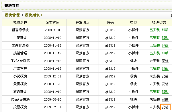 1、默认情况下,投票插件是安装好的。如果没有安装或者已卸载须再次安装,请手动安装,登录后台,单击左侧主菜单“模块”,进入其子菜单,如图1,单击“模块管理”选项,打开模块列表页面,单击插件“投票模块”后对应的“安装”,如图3和图4演示,然后完成安装过程。