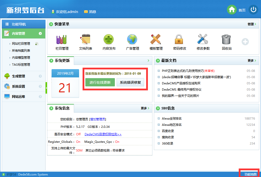 加固版后台效果:(上红框为升级按钮,下红框为旧织梦所有的功能操作入口)